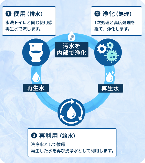 独自の浄化処理技術により、汚水をその場で浄化し、洗浄水として循環利用(リサイクル)するトイレです 。